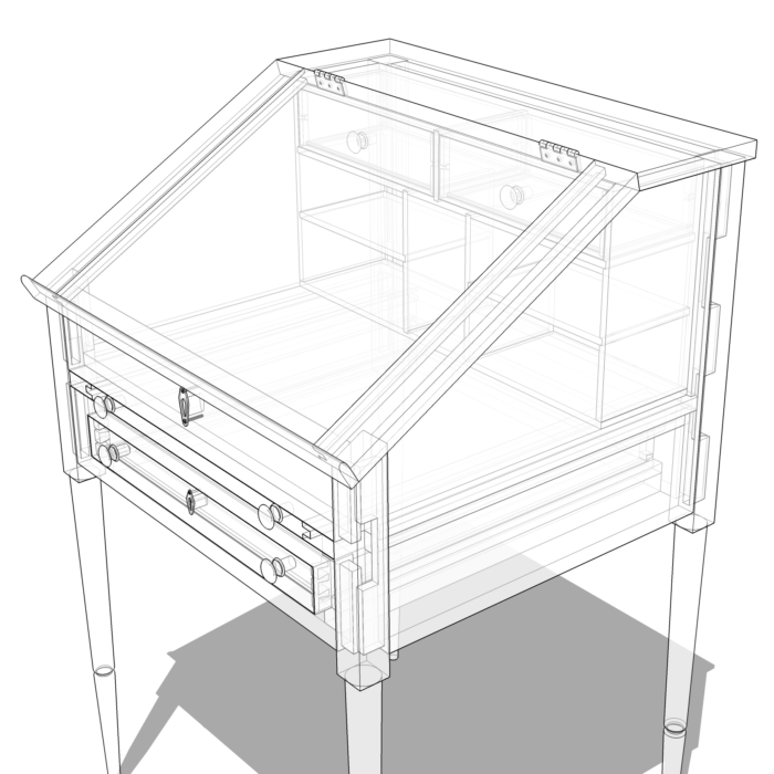 I used this model of a colonial stand upwards desk as an example in the video. As you can come across in the X-ray view, all the wooden parts are fully detailed with tenons, dovetails, and and then on.